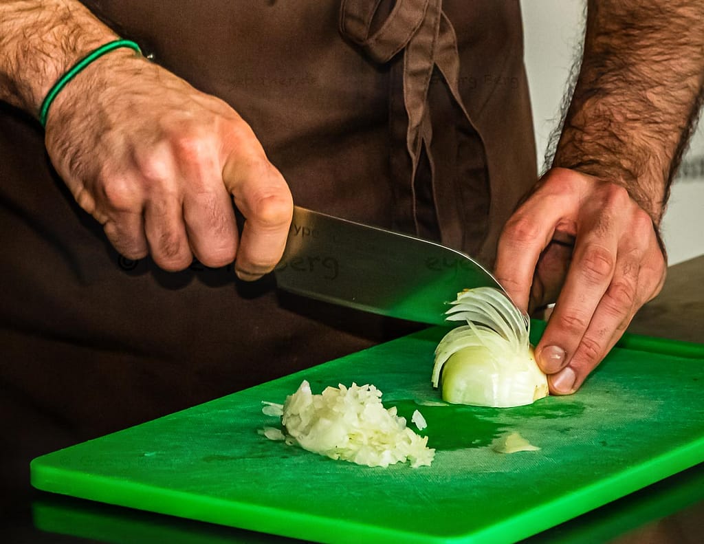 Cortando cebollas con László Papdi. Cortar una cebolla con o sin lágrimas depende en gran medida de la técnica de corte y del afilado del cuchillo / © Foto: Georg Berg