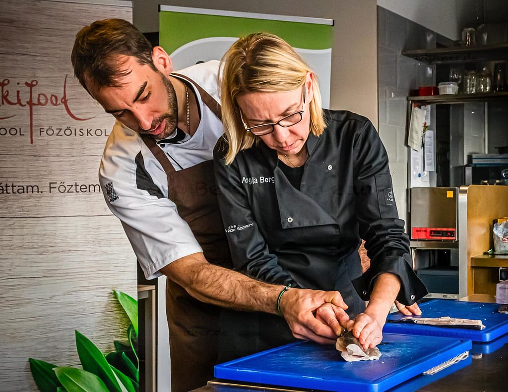 ¿Dónde se aprende la mejor manera de utilizar un buen cuchillo de chef? Respuesta: En un entorno profesional y con un profesional a tu lado. Nos reunimos con el chef profesional László Papdi sobre los tejados de Budapest, en el Instituto Culinario de Budapest. En su equipaje había una bolsa de cuchillos llena de diferentes modelos.