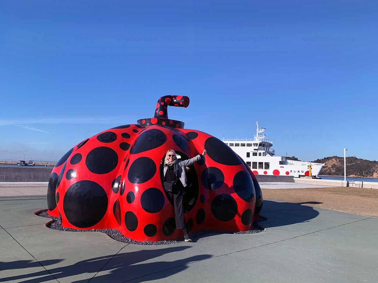 Takamatsu, capital de la prefectura de Kagawa, es un excelente punto de partida para excursiones de un día a las islas artísticas del Mar Interior de Seto. Lanchas rápidas y transbordadores enlazan regularmente las islas. El tiempo de viaje a Teshima y Naoshima oscila entre 30 y 45 minutos. En las islas, los visitantes pueden alquilar bicicletas eléctricas para visitar las diversas instalaciones artísticas. Debería tomarse al menos un día para visitar cada isla, porque además de los museos y edificios de arte, también hay muchos objetos artísticos de libre acceso en el paisaje. Directamente en el puerto de Naoshima, los visitantes ya pueden ver la Calabaza Roja de Yayoi Kusama. El Kurbis rojo con lunares incluso se puede pisar, por lo que es muy Instagrammable.