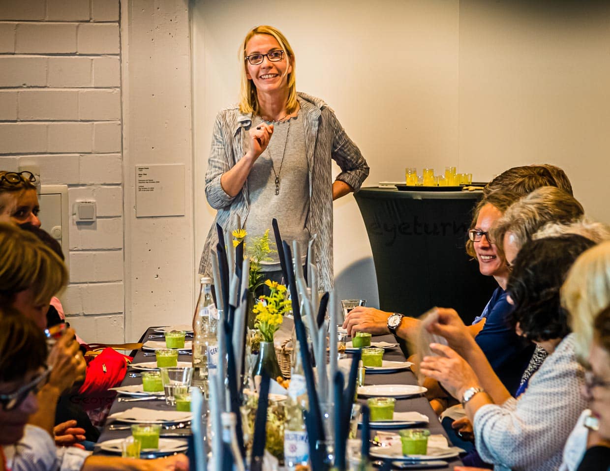 Desde principios de 2019, el formato Kunst & Kochwerk de Angela Berg tiene lugar en otro museo más. Acompañando a las exposiciones temporales del Museum der Niederrheinischen Seele – Villa Erckens, los invitados toman asiento en las pequeñas mesas de bistrot de la planta baja del museo tras una visita guiada a la exposición y degustan un menú sorpresa correspondiente al arte: 2019 a la exposición “Helmut Schmidt – Caricaturas” / Unter Wölfen / Magret Schoten-Richter Materia y objetos.