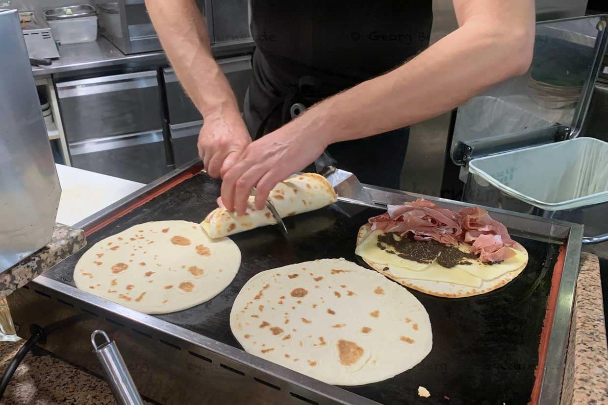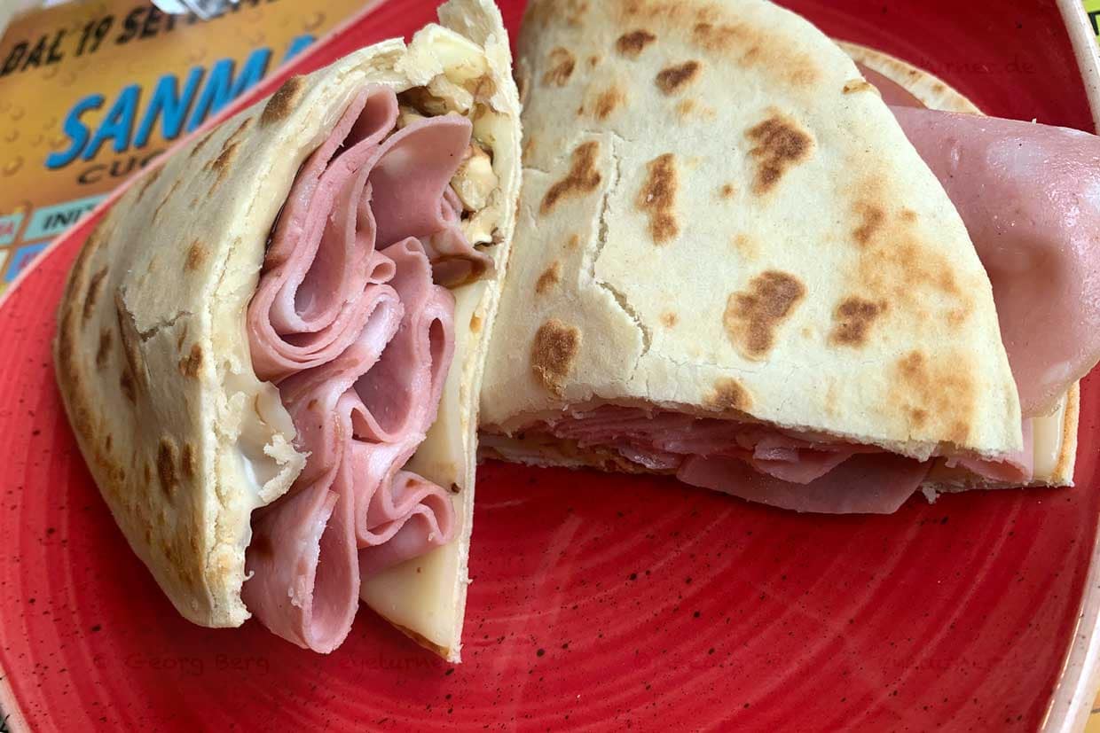 En San Marino, la piadina es imprescindible y es similar a la versión fina de Rímini. Este plato tiene una larga historia que se remonta a la antigua Roma; la primera mención data de 1317. La piadina solía llamarse “el pan de los pobres”. En San Marino, este pan plano y fino se encuentra en muchos bares y restaurantes. Los menús suelen tener muchas páginas. Los rellenos más populares incluyen jamón curado, mortadela, Parmegiano, squacquerone, trufa o salami, a menudo combinados con rúcula o tomates.